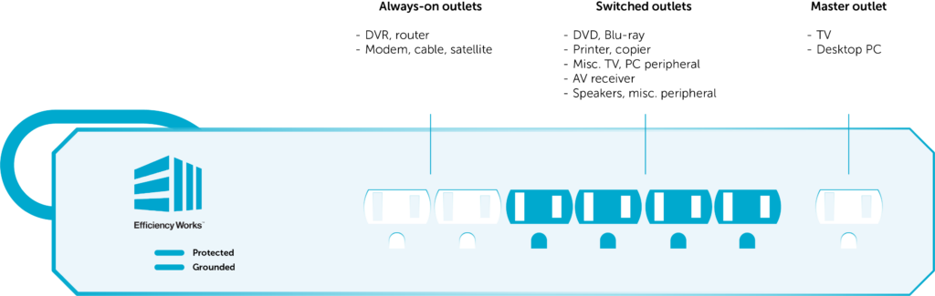 - Entertainment center: Your TV is the master device, your gaming console and soundbar are plugged into controlled outlets and your Wi-Fi router is plugged into an always-on outlet. When you turn off the TV, your gaming console and soundbar shut off – but your Wi-Fi stays on. No more phantom power draining your wallet.